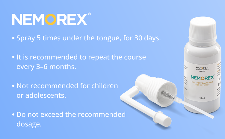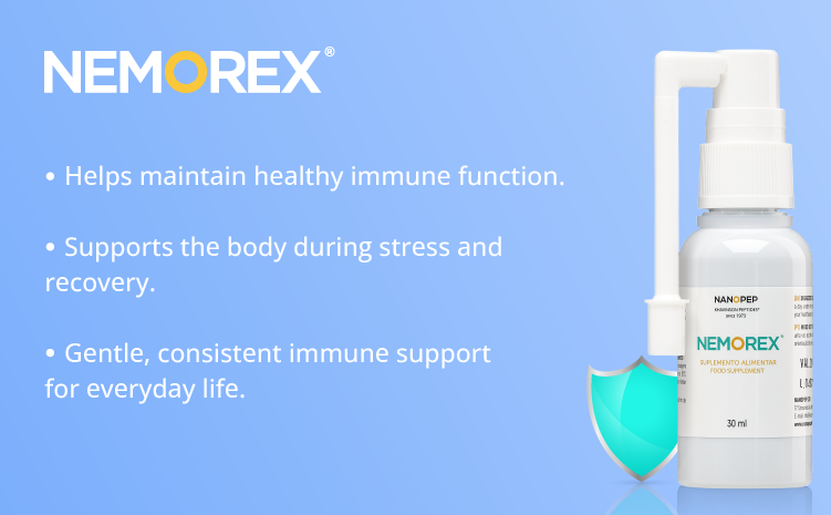 NEMOREX spray uses its peptide complex to act on the molecular level, directly on the immune-regulating peptides, whereas common immune boosters depend mostly on general nutrition. This specific course of action enables personalized immune modulation and minimizes the risks of overactivation. Also, the spray form ensures rapid absorption and action.